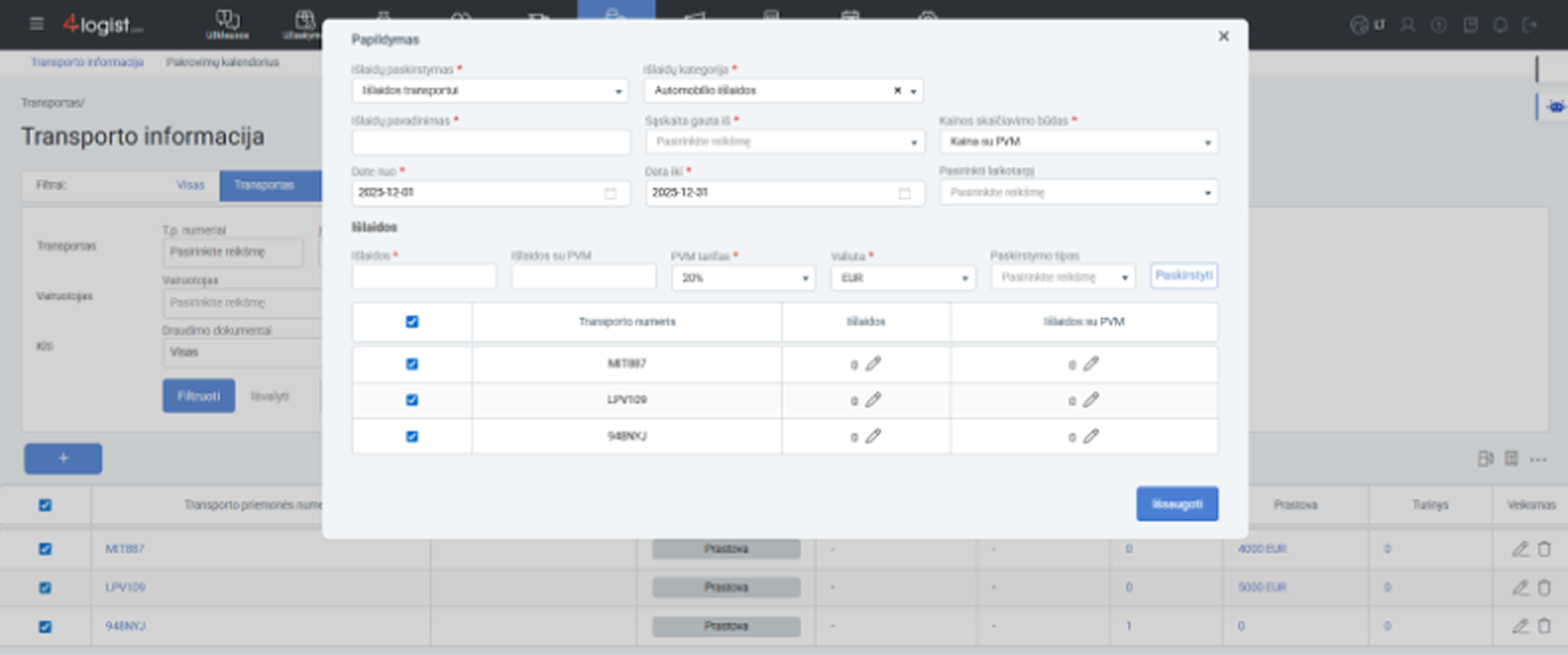 3. Spaudžiate „Pridėti išlaidas“ ir pasirenkate paskirstymą transportui.