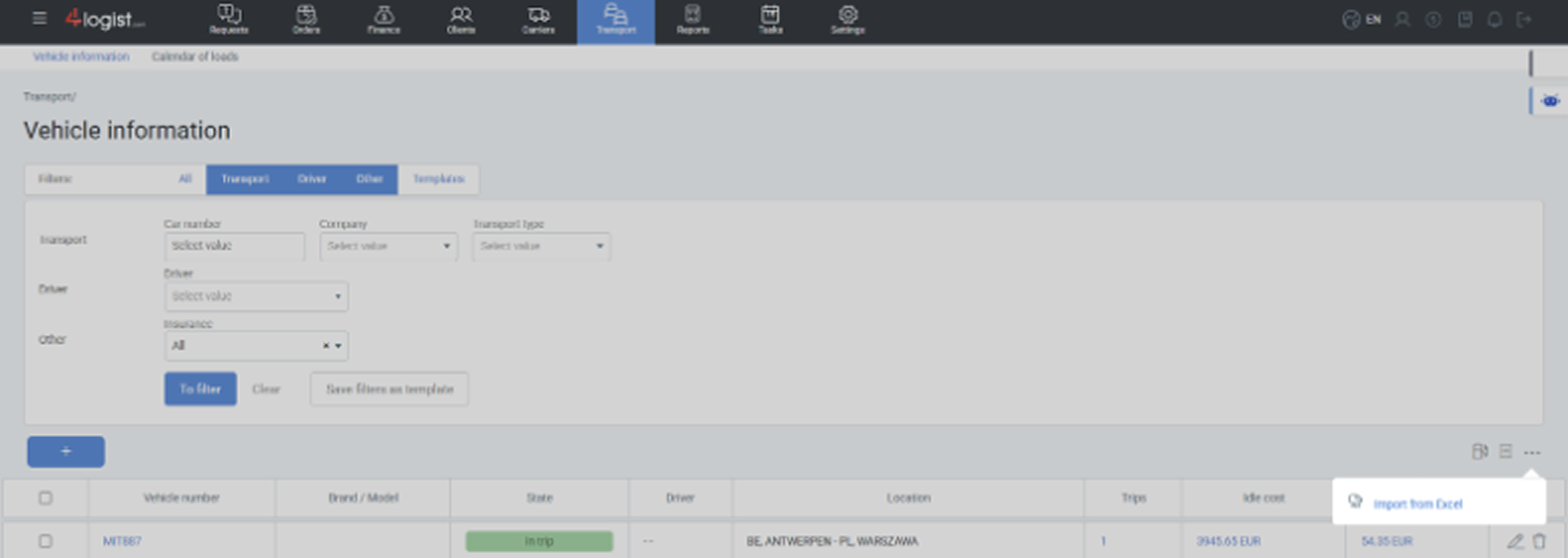 - wgrać pojazdy przez Excel,