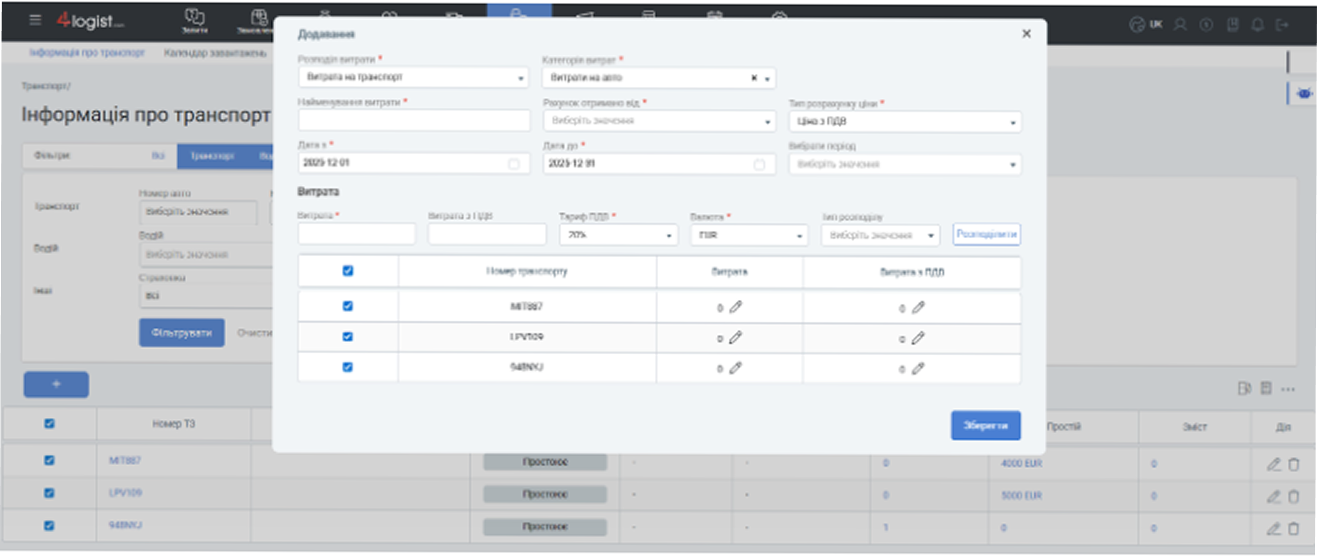 Раніше масове додавання витрат було доступне лише для рейсів. Тепер ми розширили цю логіку й на власний транспорт у 4logist.