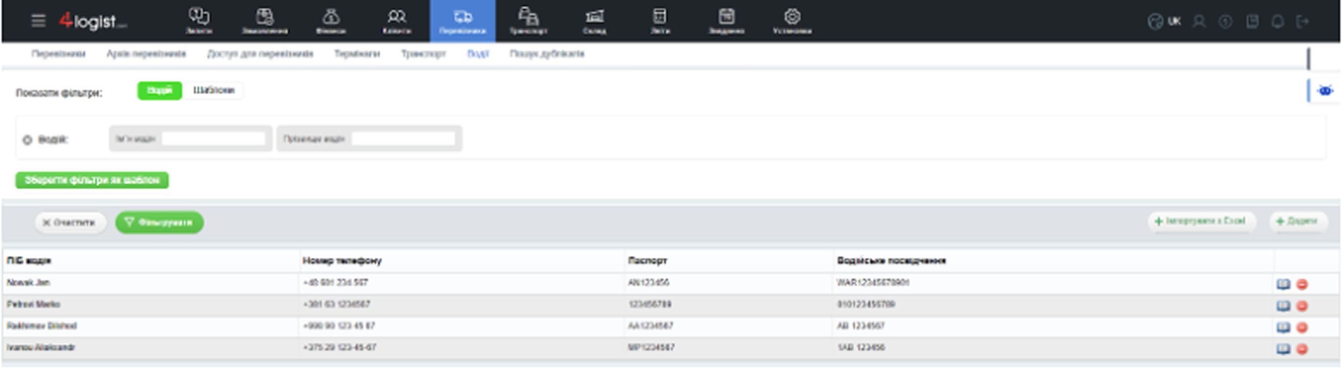Тепер водіїв не потрібно додавати вручну по одному. У блоці власного транспорту в 4logist з’явилася кнопка «Імпорт з Excel»:
